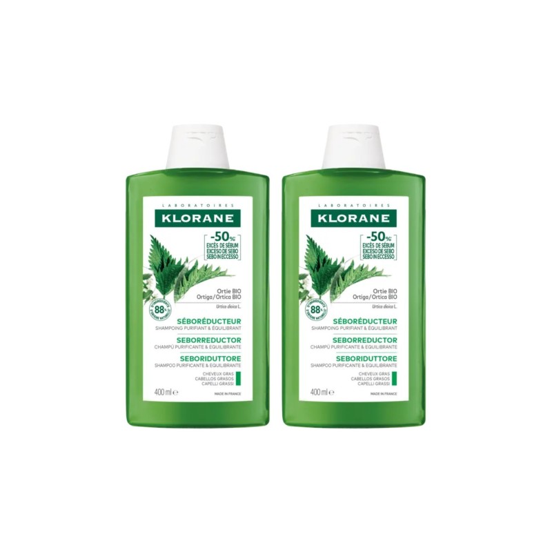 Klorane duplo seborreductor champú a la ortiga bio es un champú purificante y equilibrante de alta tolerancia, diseñado específicamente para cabellos grasos y cueros cabelludos oleosos que buscan reducir el exceso de sebo hasta un 50% desde el primer mes, ideal para adultos y adolescentes con cabello graso que sufren de brillo excesivo o irritación. Cuenta con propiedades seborreguladoras y purificantes, este dúo pack limpia suavemente, regula la producción de sebo y deja el cuero cabelludo fresco y equilibrado, sin resecar el cabello. Su acción antisebo y revitalizante promueve un cabello más ligero, voluminoso y saludable, siendo perfecto para uso frecuente en rutinas de cuidado capilar para cabellos grasos, integrándose fácilmente para un cuero cabelludo purificado.
