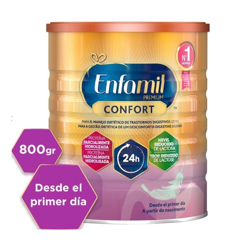 Enfamil Premium Confort es una leche para lactantes parcialmente hidrolizada, cuyas proteínas han sido fragmentadas en tamaños más pequeños, haciéndola más fácil de digerir. Contiene una cantidad reducida de lactosa por lo que hace que tengan una mejor digestión. Contiene una mezcla especial de: